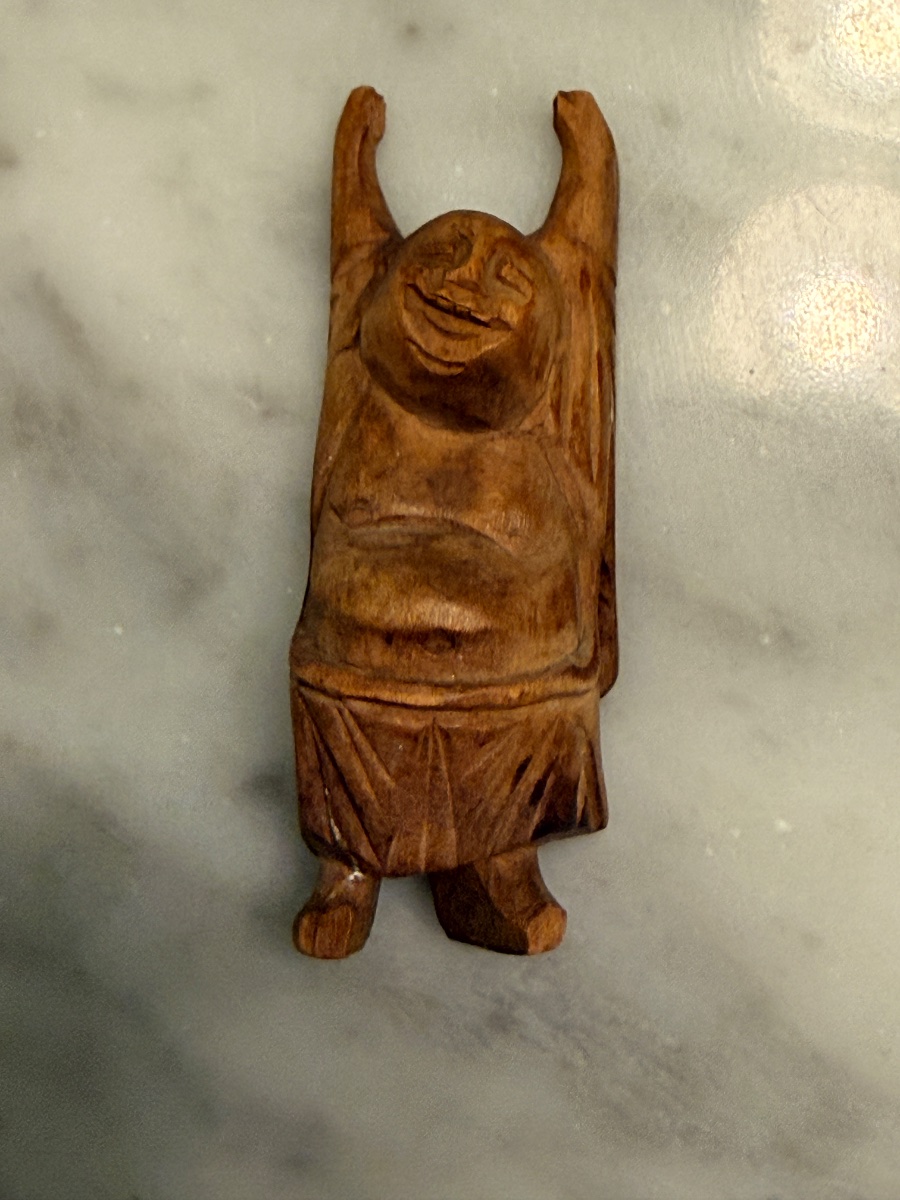 A spirited, hand-carved wooden representation of Budai, the semi-historical Chinese monk known for his infectious joy and abundance.