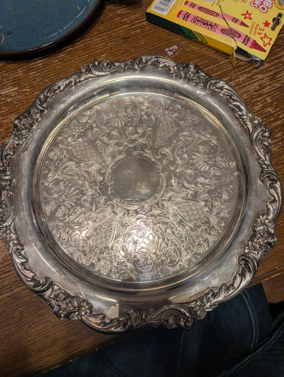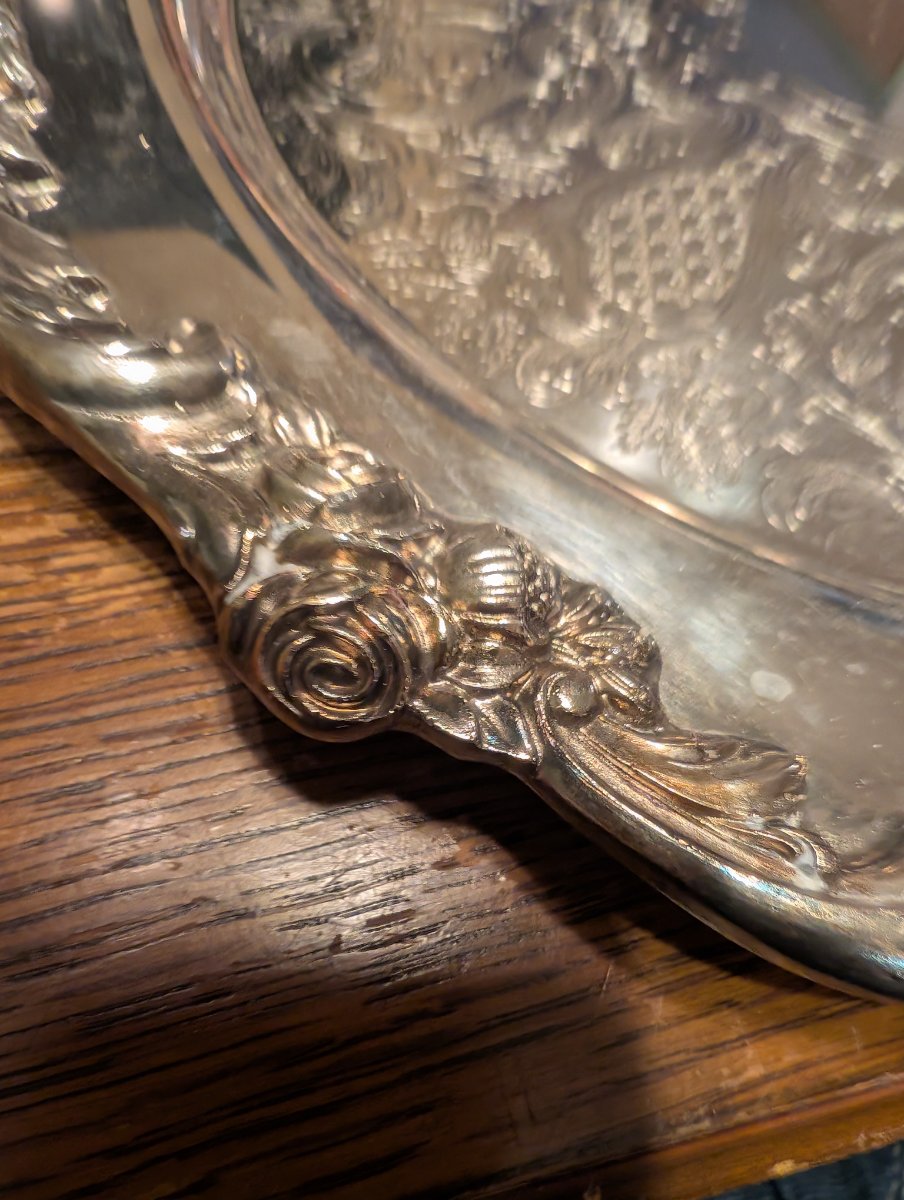 The tray shows visible tarnish and some 'bleeding' where the silver plate is beginning to thin, along with white residue from dried silver polish in the ornate crevices. Silver-plated items from this era are plentiful; the value is driven primarily by the decorative appeal and the historical interest of the Dow Chemical connection.