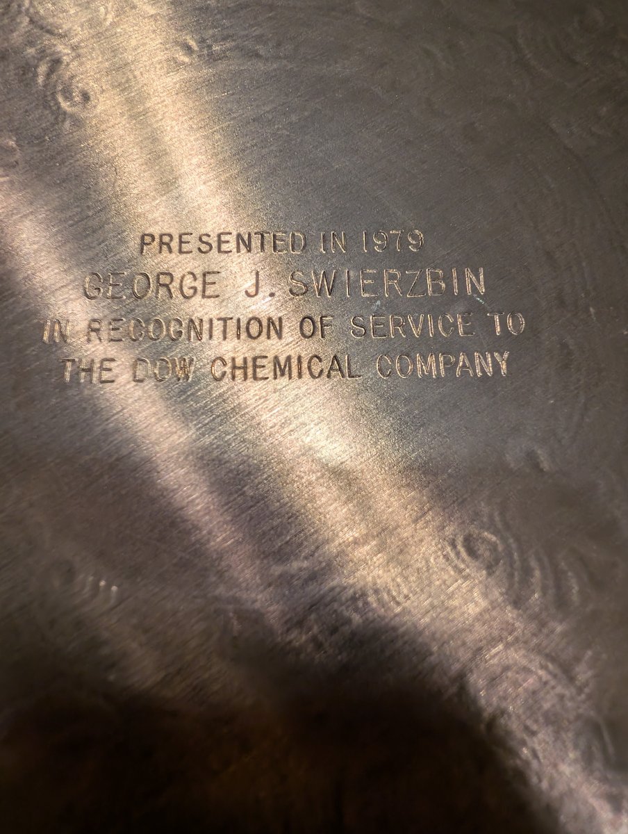 In 1979, George J. Swierzbin was honored with this tray, a classic symbol of corporate gratitude during the peak of the American industrial era.