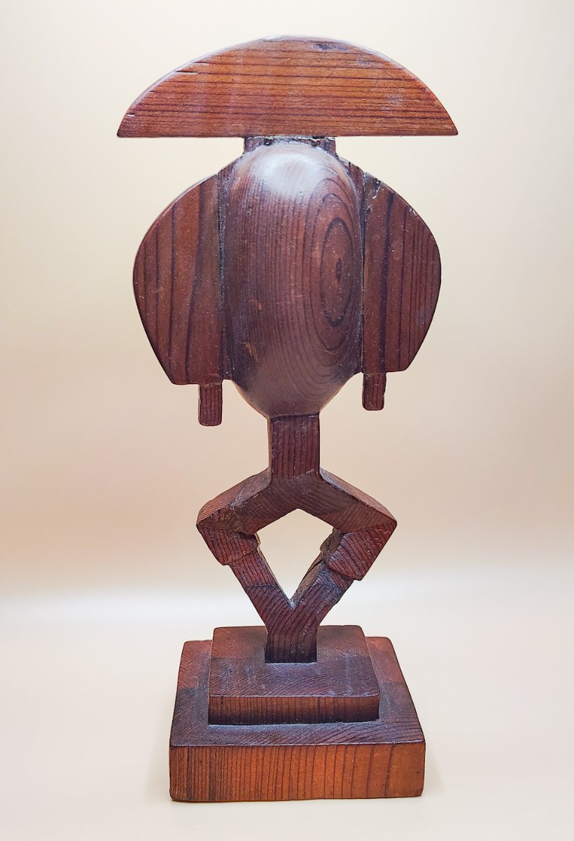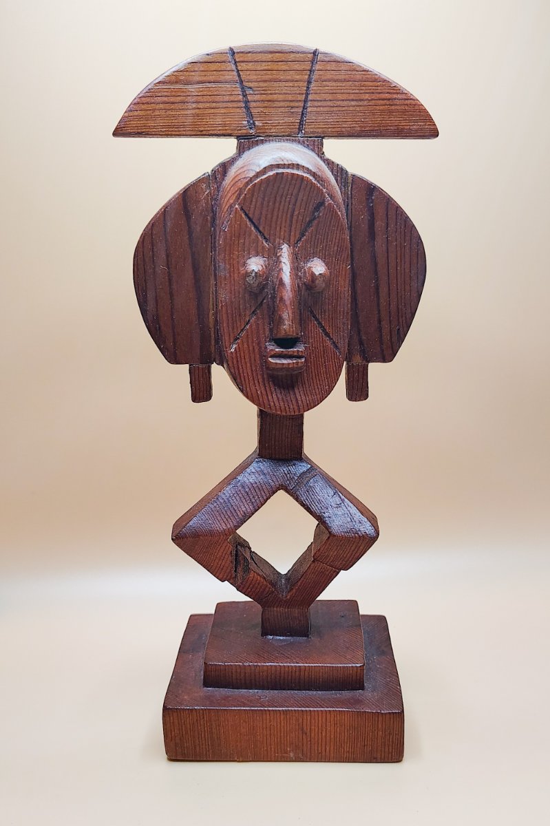 A bold, hand-carved wooden sculpture inspired by the traditional Ashanti Akua'ba fertility dolls of Ghana.