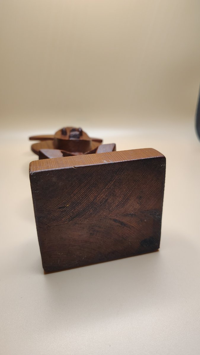 The piece shows minor surface abrasions and dust in the crevices consistent with age. This is a classic 'export' or 'tourist' piece; while not a museum-grade ritual object, it has a strong secondary market among Mid-Century Modern collectors who value its…