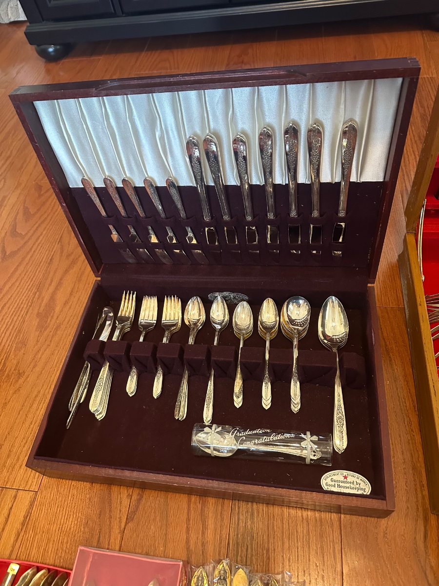 The set appears to be in excellent vintage condition with a very desirable patina and minimal 'plate loss' (where the base metal shows through). Value is driven by the completeness of the set, the presence of the original chest, and the rare 'Graduation' commemorative spoon.