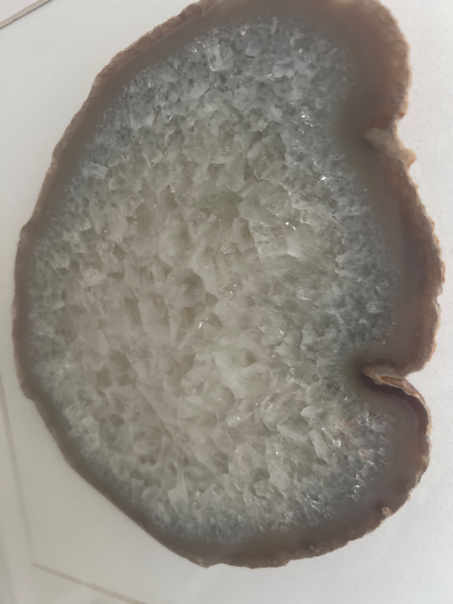 A substantial, polished cross-section of a natural volcanic geode featuring a translucent chalcedony perimeter and a sparkling crystalline quartz center.