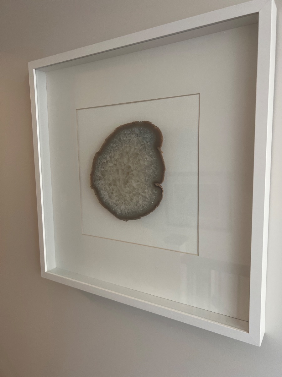 The specimen appears to be in excellent condition with no visible fractures or 'bruising' to the polished surface. The modern frame is clean and well-maintained. Value is determined by the size of the specimen (which is significant here), the clarity of the central crystals, and the quality of the professional framing, which…