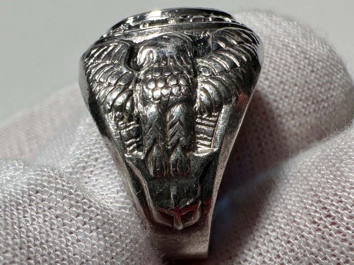 The ring shows heavy 'honest wear' consistent with daily use. Value is primarily driven by the silver content and the collectibility of mid-century military memorabilia.