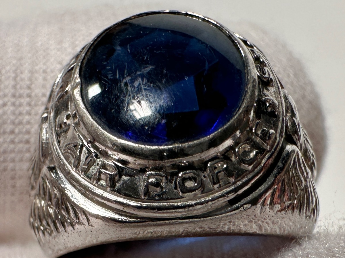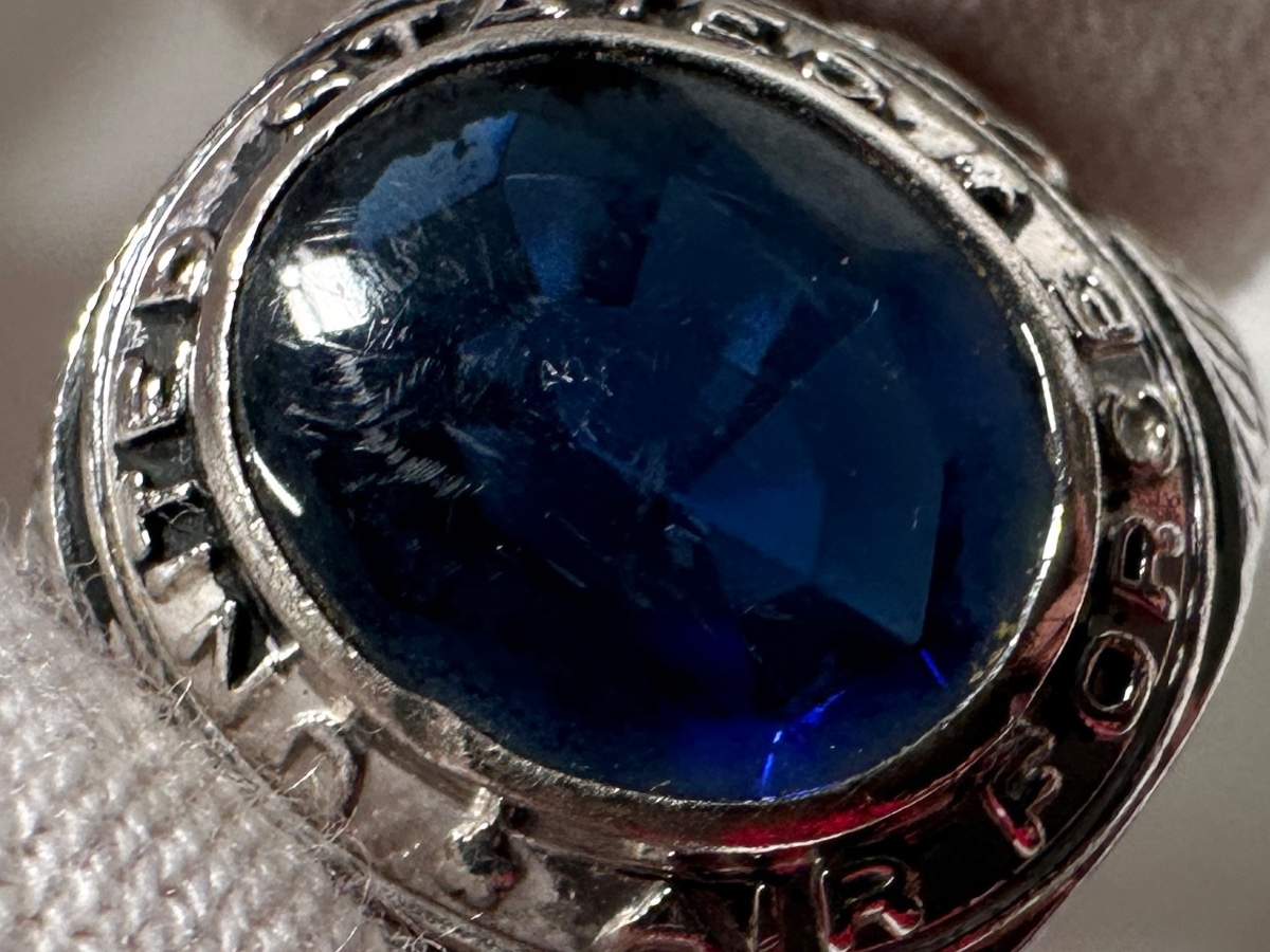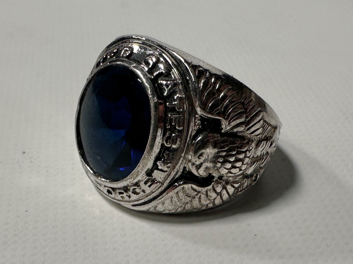 A classic military service ring featuring a deep blue faceted stone surrounded by 'United States Air Force' in high-relief lettering.