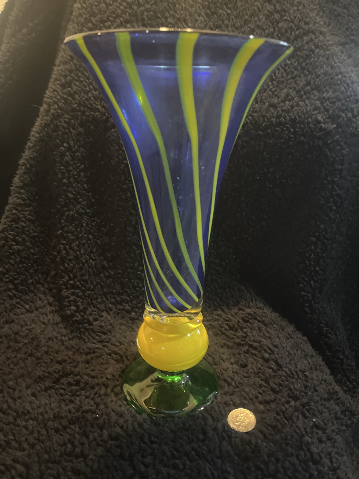 A vibrant, hand-blown glass vessel featuring a cobalt blue trumpet body with spiraling yellow cane-work, supported by a stacked yellow and green base.