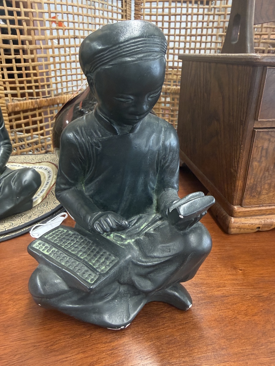 A mid-century decorative sculpture cast in Durastone, depicting a young scholar in traditional Asian attire focused on an abacus.