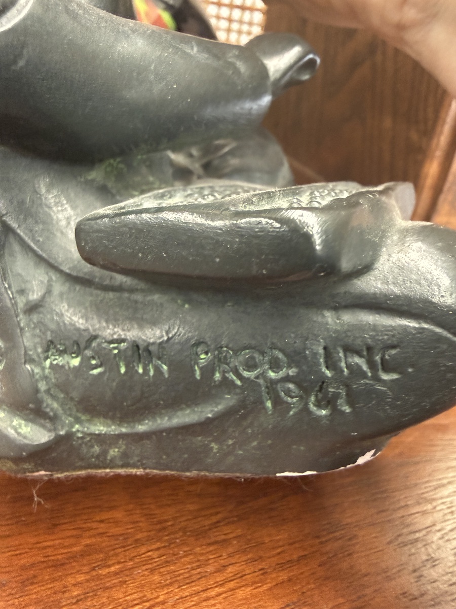 The piece shows several 'flea bite' chips on the base and the edges of the abacus, revealing the white plaster beneath the dark finish. Austin Productions pieces are widely collected, though their mass-produced nature keeps prices accessible.