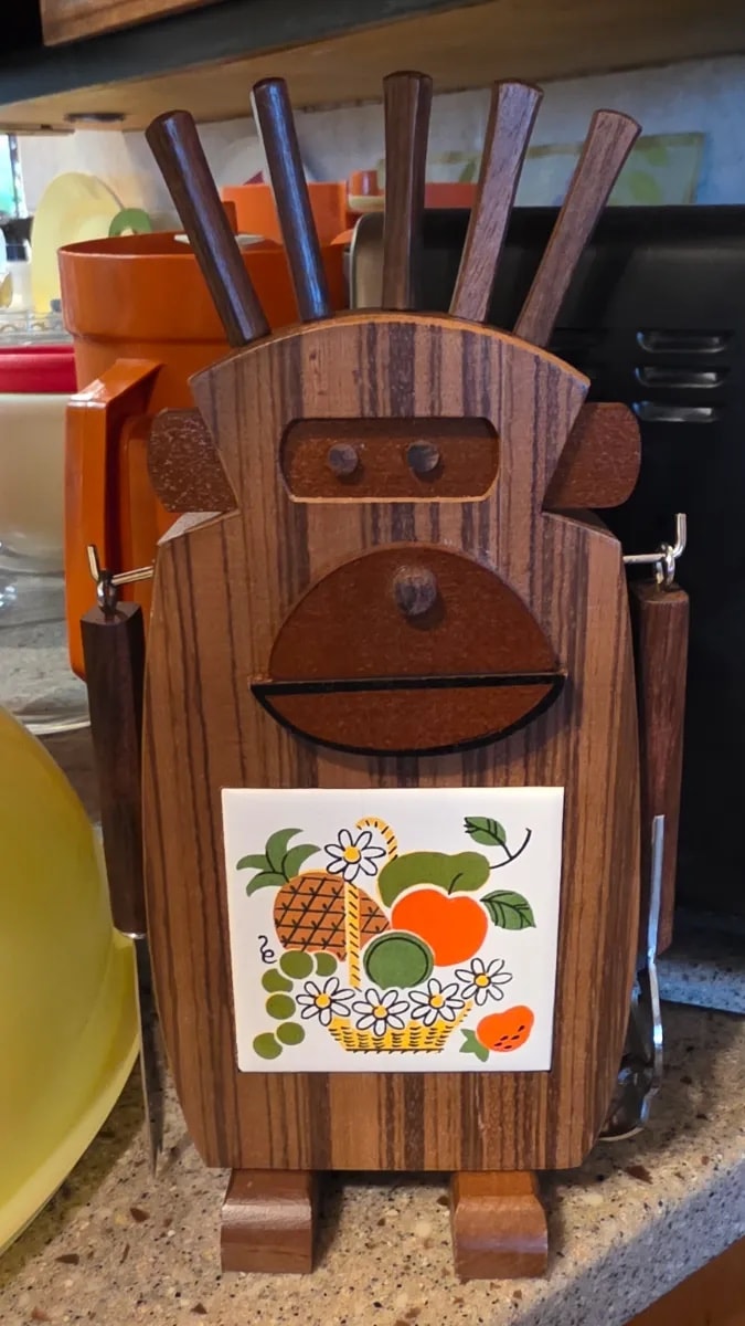 This is a whimsical, anthropomorphic wooden kitchen organizer designed in the shape of a monkey, featuring a colorful ceramic tile inset.