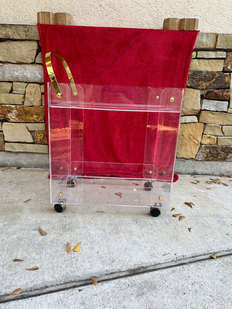 A quintessential piece of 'invisible' furniture, this two-tier cart features thick-walled acrylic panels joined by polished brass-tone hardware.