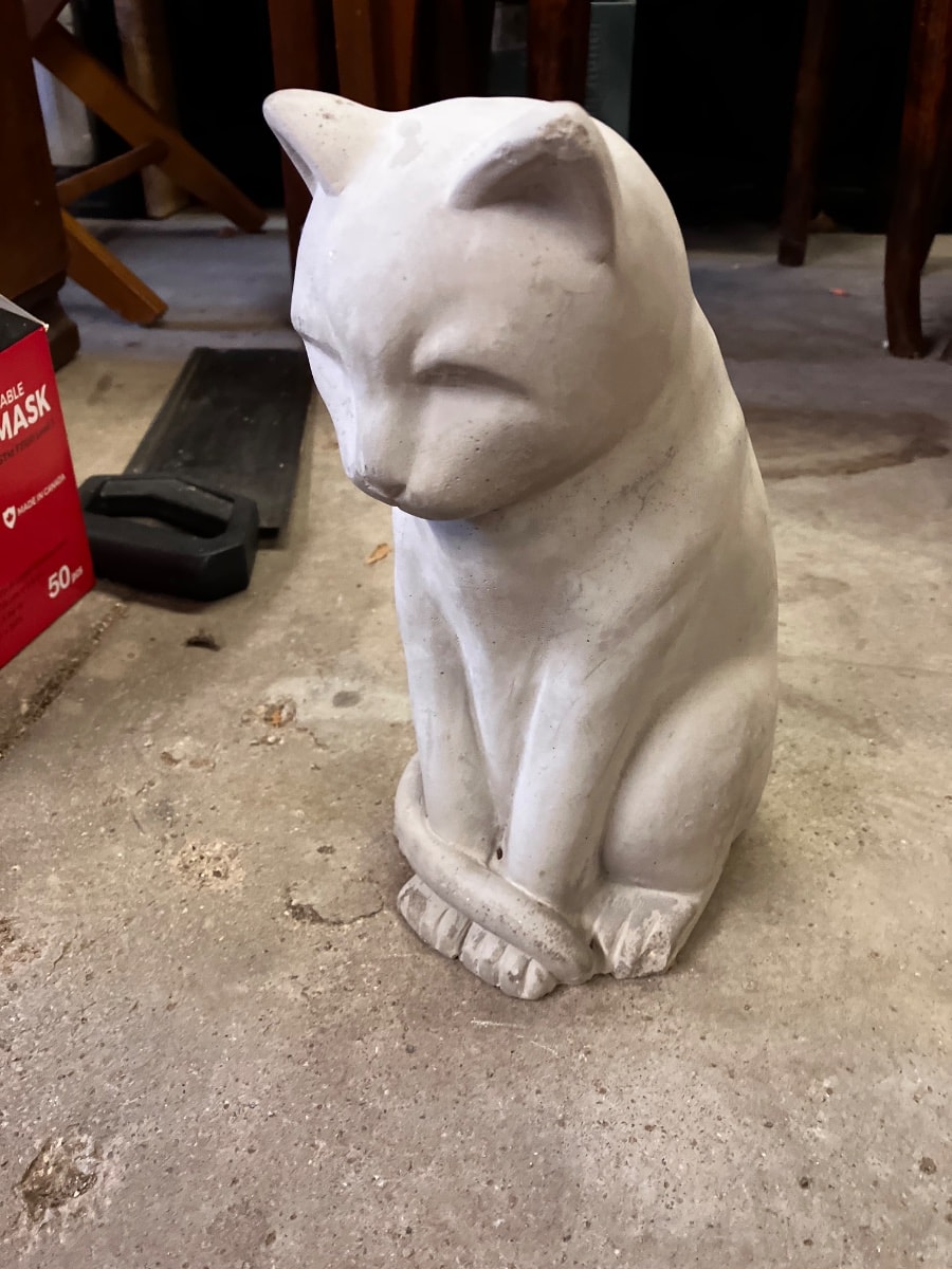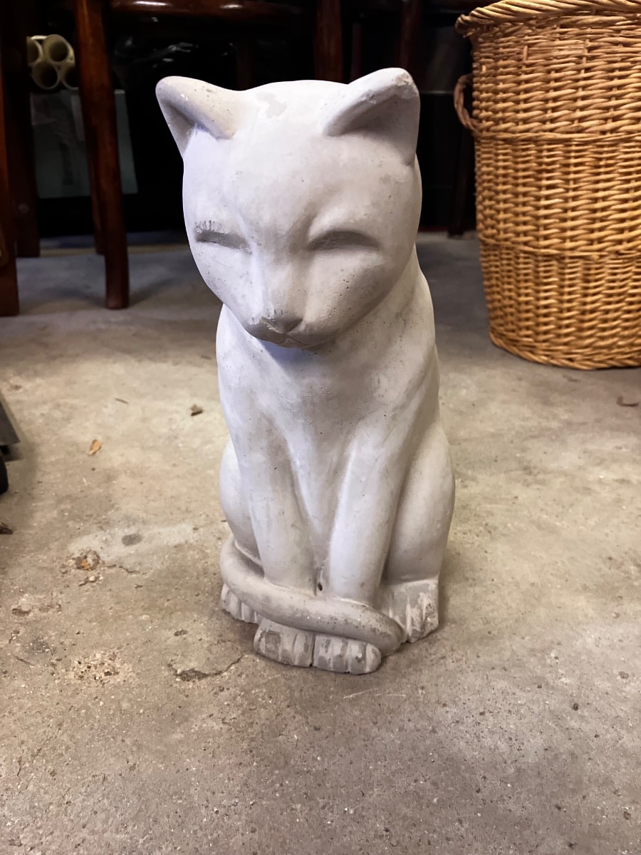 The piece shows visible chipping on the tips of both ears and some minor losses around the base and paws. Value is driven by the popular Mid-Century Modern aesthetic and the enduring appeal of cat-themed decor.