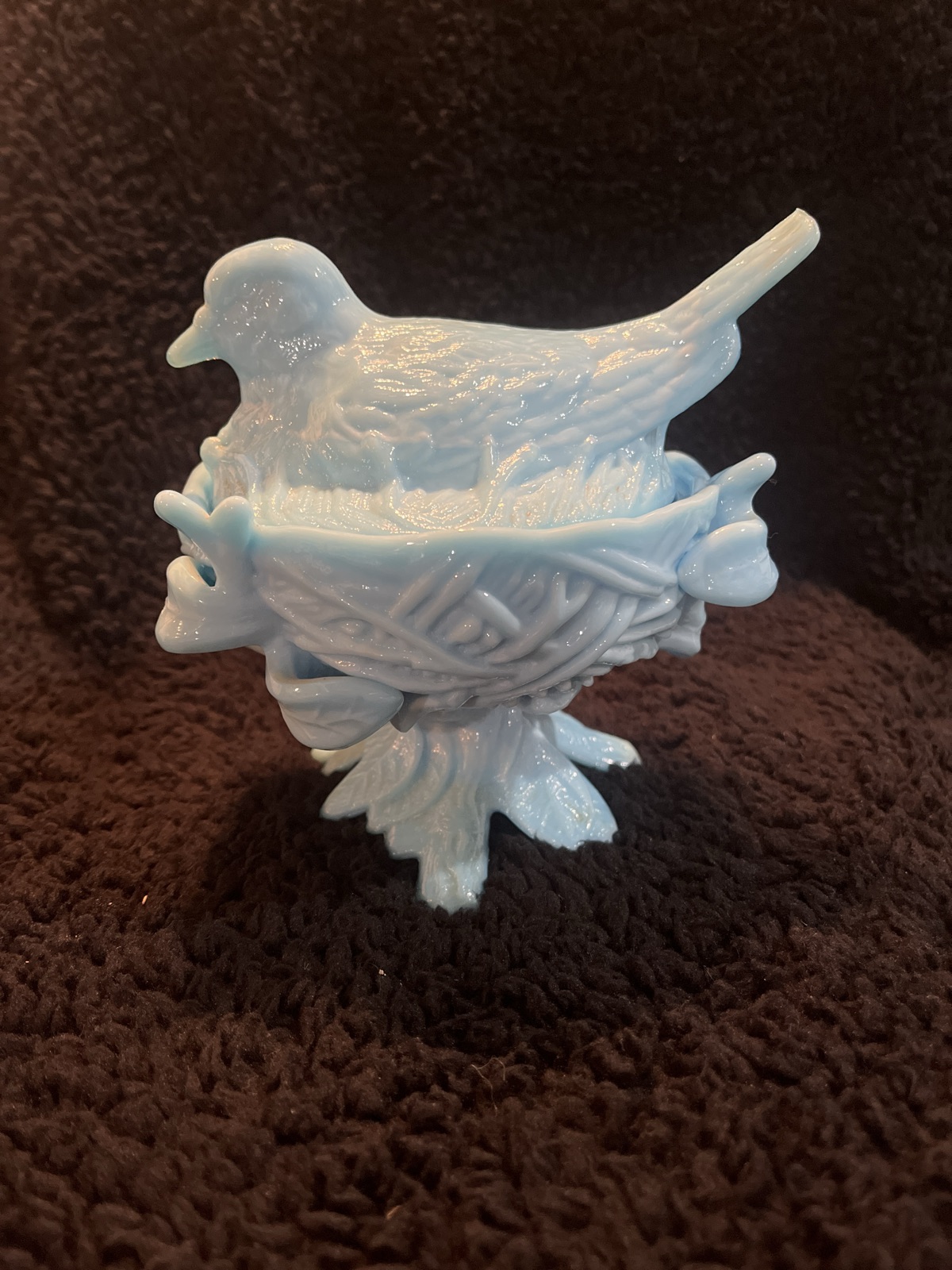 Based on the photos, the piece appears to be in excellent vintage condition with no visible chips to the bird's beak or the rim of the nest. While white milk glass is common, the 'Blue Mist' color is more desirable to collectors.