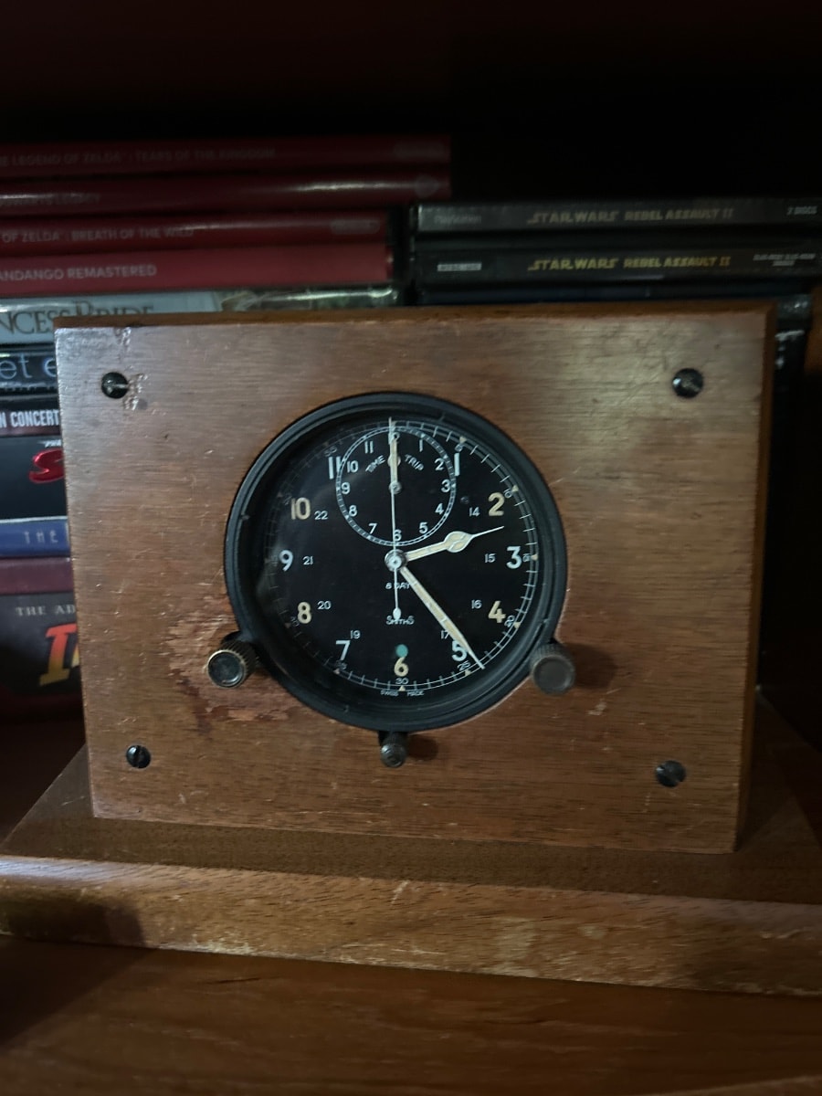 The dial and crystal appear to be in excellent condition with very little of the 'crazing' often seen in aged aviation plastics. There is some visible surface wear and scuffing on the wooden mount, particularly around the lower left knob, which is consistent with decades of use as a desk clock.