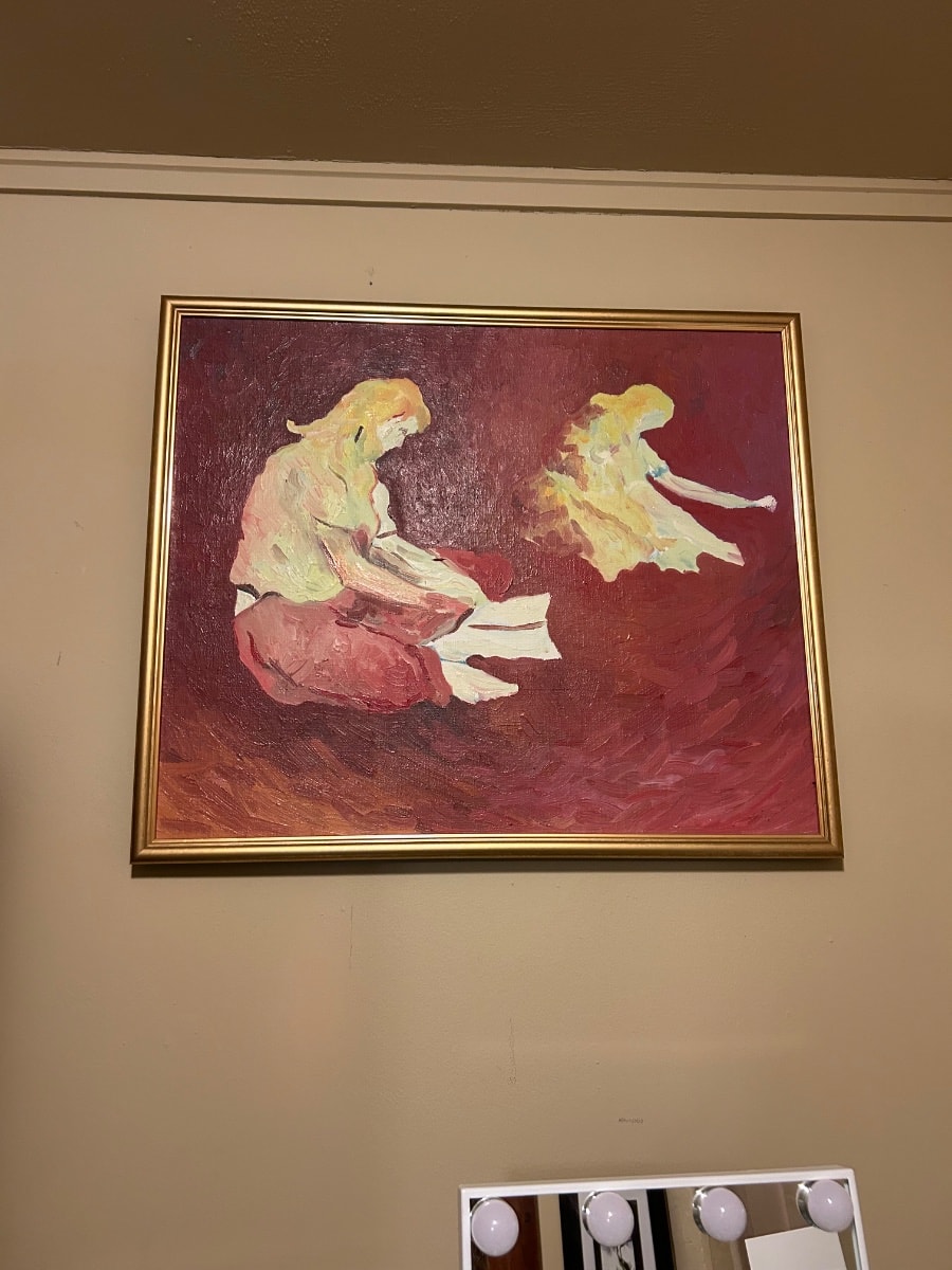 Post-war artists often abandoned the 'perfect' realism of the past to capture the internal world of feelings and the hazy nature of memory. This piece captures an intimate connection—perhaps a mother reading to a child or two sisters sharing a secret—but it…
