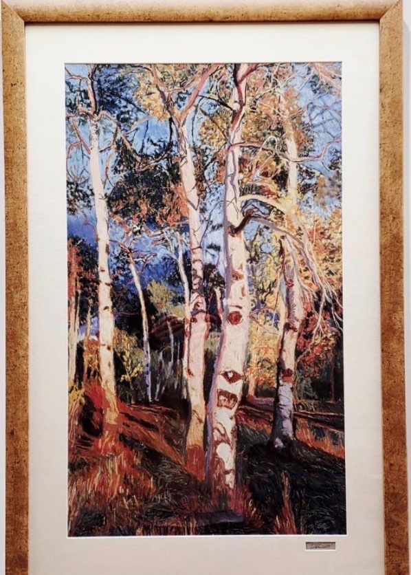 This is a vibrant, highly textured depiction of an aspen or birch grove, utilizing a bold palette of cobalt blues and burnt oranges to create a sense of depth and light.