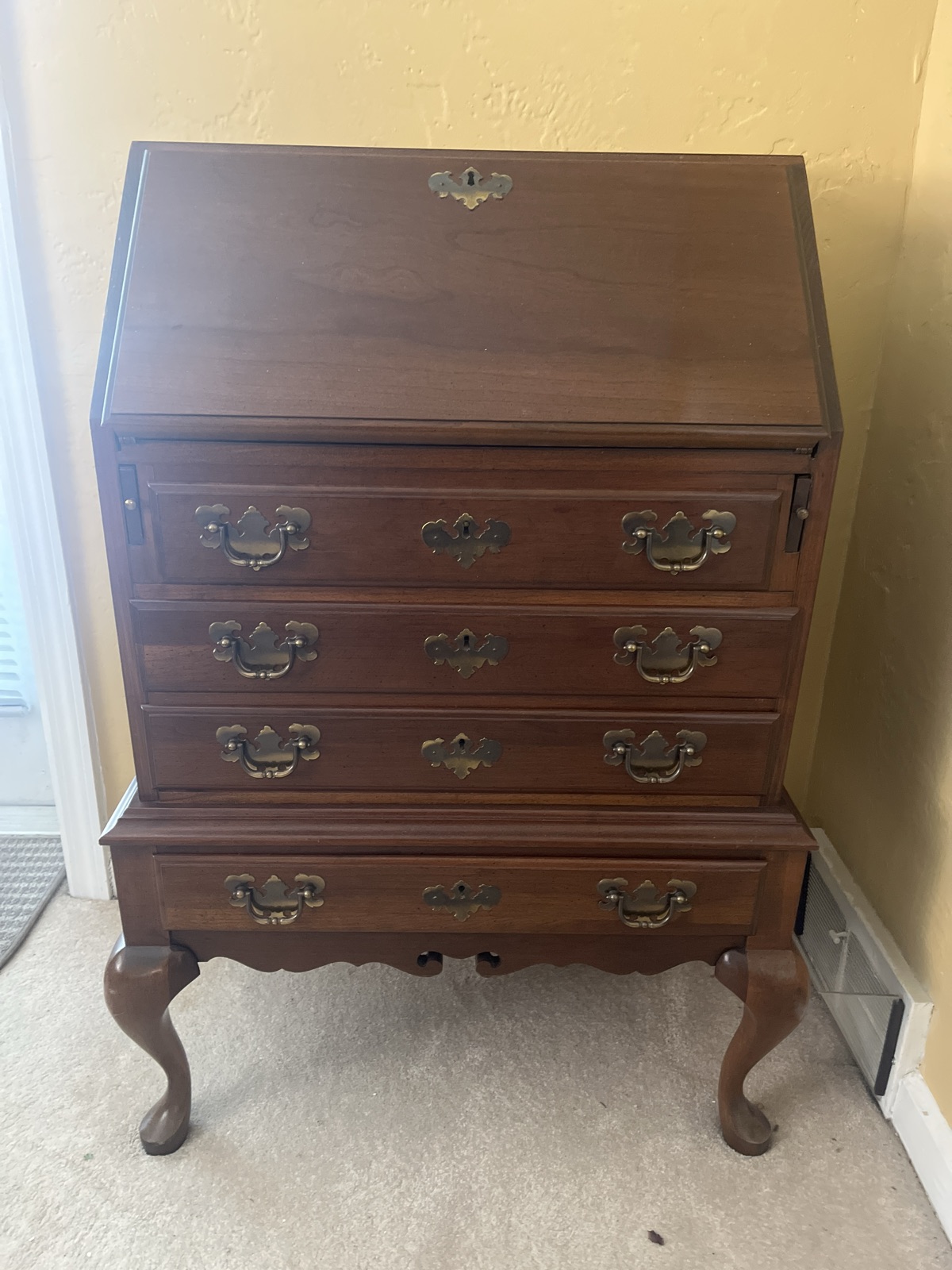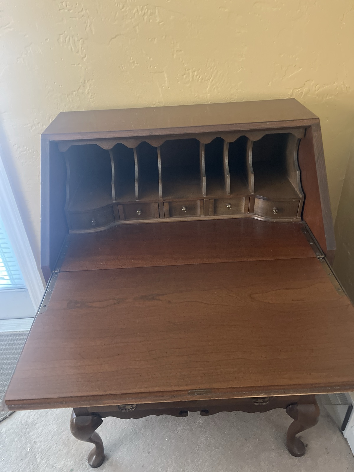 The piece appears to be in very good vintage condition with a consistent finish and all original hardware present. Values for Colonial Revival brown furniture are currently conservative due to market trends, but 'petite' desks with high-quality interiors remain desirable for their…