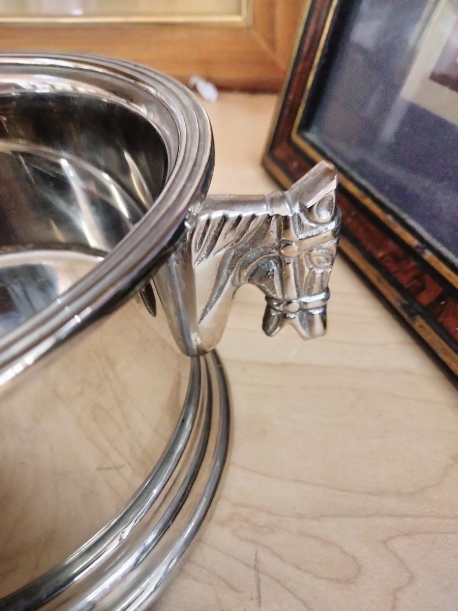 A polished, nickel-plated or stainless steel wine chiller featuring classic cast horse-head handles.