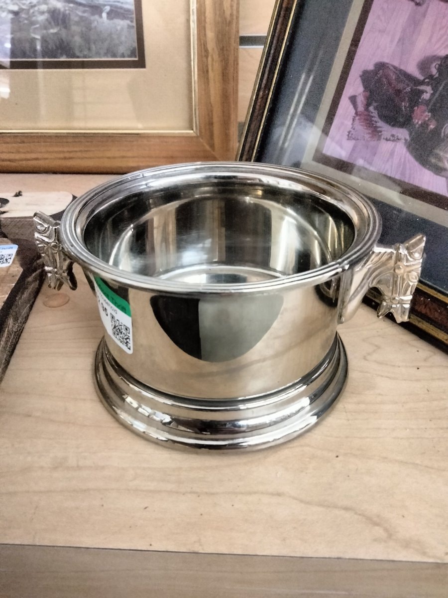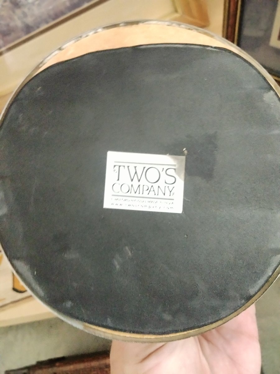 The piece shows minor surface scuffing and light pitting consistent with regular use as an ice bucket. While Two's Company is a contemporary brand rather than an antique maker, their equestrian-themed items remain highly collectible for those styling 'Grandmillennial' or…