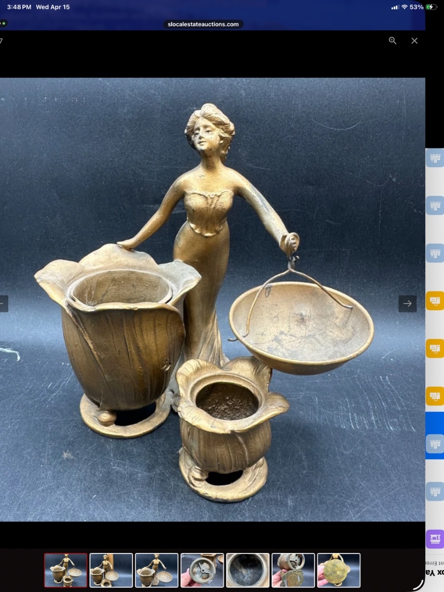 A charming and functional desk or vanity accessory featuring a graceful maiden in the 'Gibson Girl' style, flanked by two stylized tulip-form vessels and a suspended scale-like bowl.