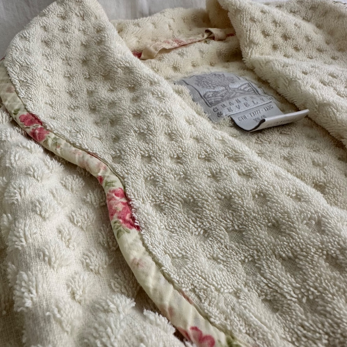 This is a luxury 'hobnail' or 'popcorn' tufted cotton chenille robe, a garment that elevated American domestic nostalgia into a Hollywood status symbol.