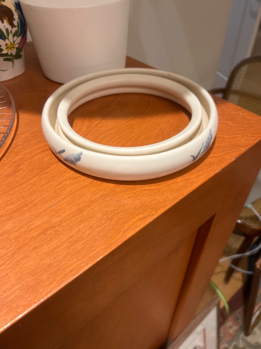 A charming ceramic 'posy ring' designed to hold water and short-stemmed flowers in a low-profile circular arrangement.