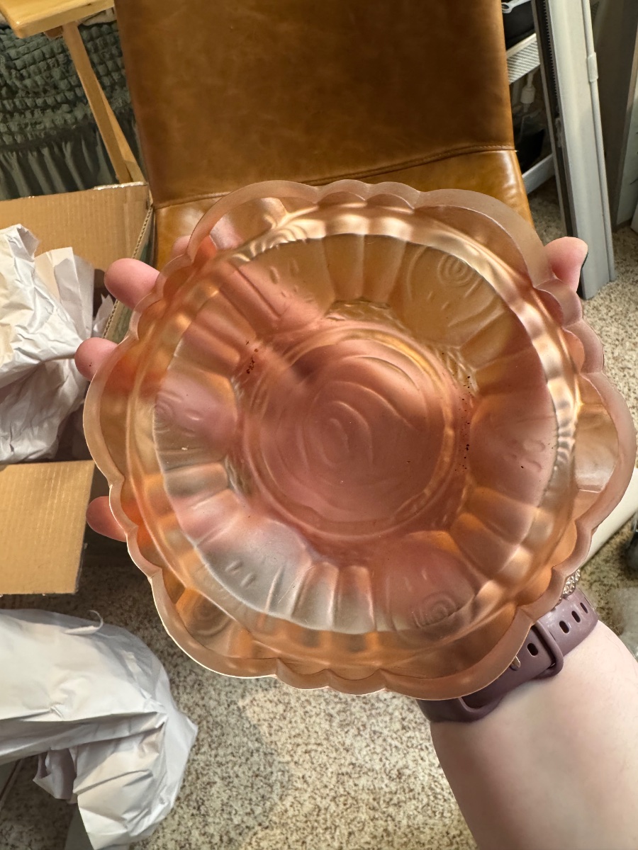 This is a quintessential example of American Depression glass in the beloved 'Sharon' pattern, characterized by its lush, embossed cabbage roses and warm pink hue.