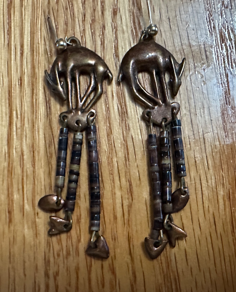 A pair of early, hand-assembled earrings by the legendary Laurel Burch, featuring her signature stylized animal motifs in cast metal.