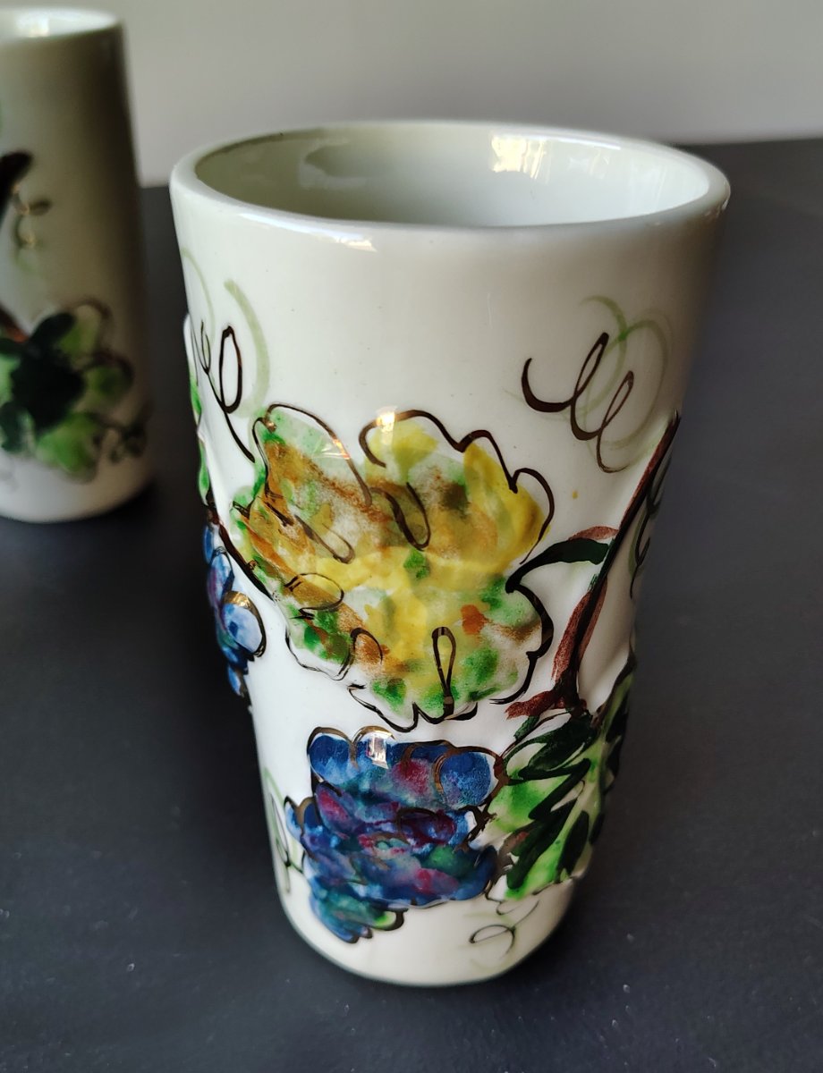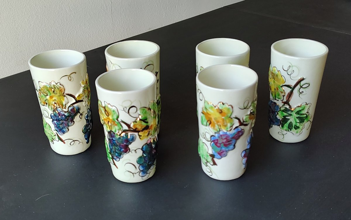 A rare set of six hand-decorated ceramic tumblers featuring high-relief grape clusters and hand-painted vine motifs.
