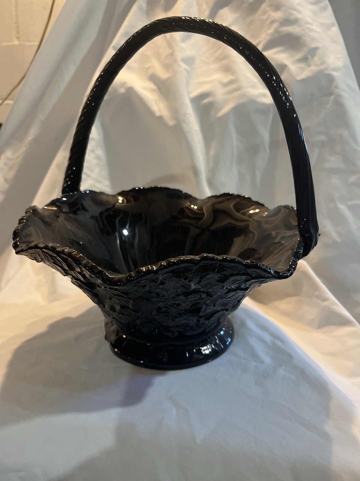 The glass retains a high gloss and the handle appears securely attached without visible stress fractures. Value for L.E. Smith black glass is steady, with baskets featuring intact applied handles and complex crimping fetching the higher end of the range.