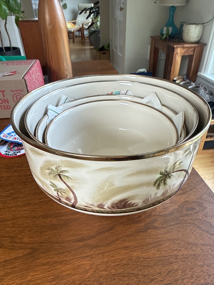 A set of three nesting bowls featuring a lush, watercolor-style tropical palm tree motif.