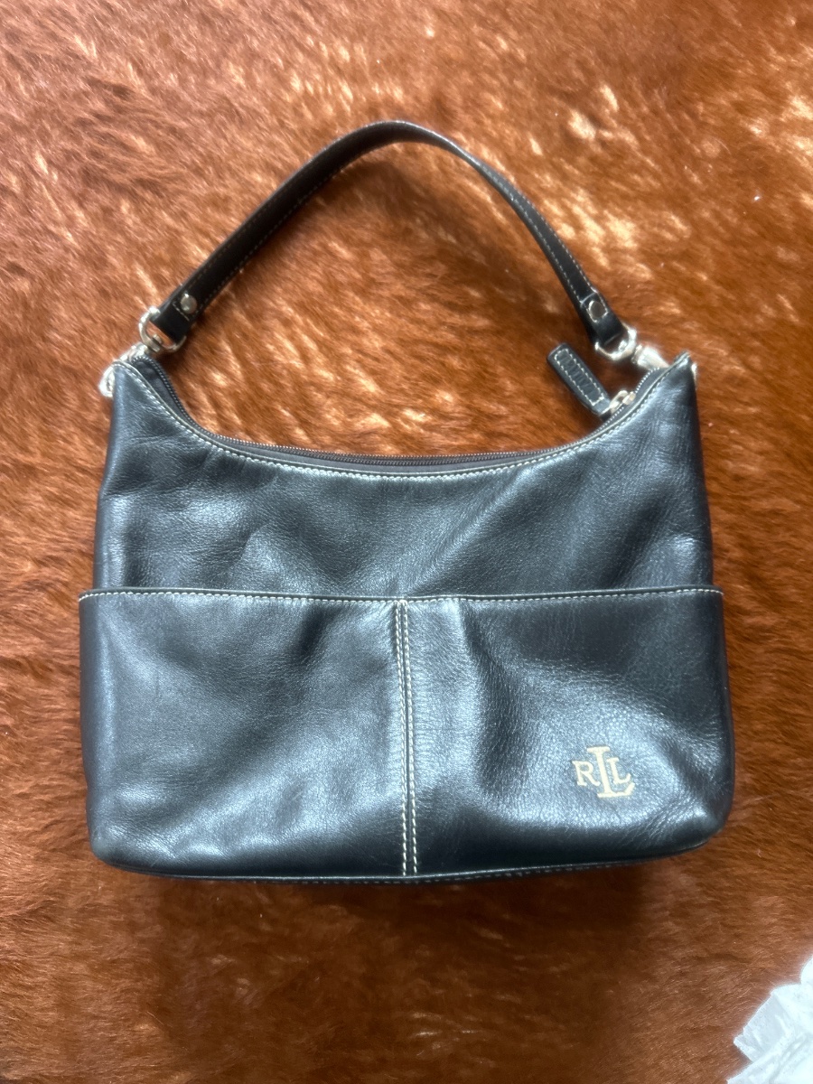 This is a classic 'hobo' style shoulder bag crafted from supple pebbled leather, featuring the iconic 'RL' monogram in gold-tone hardware.