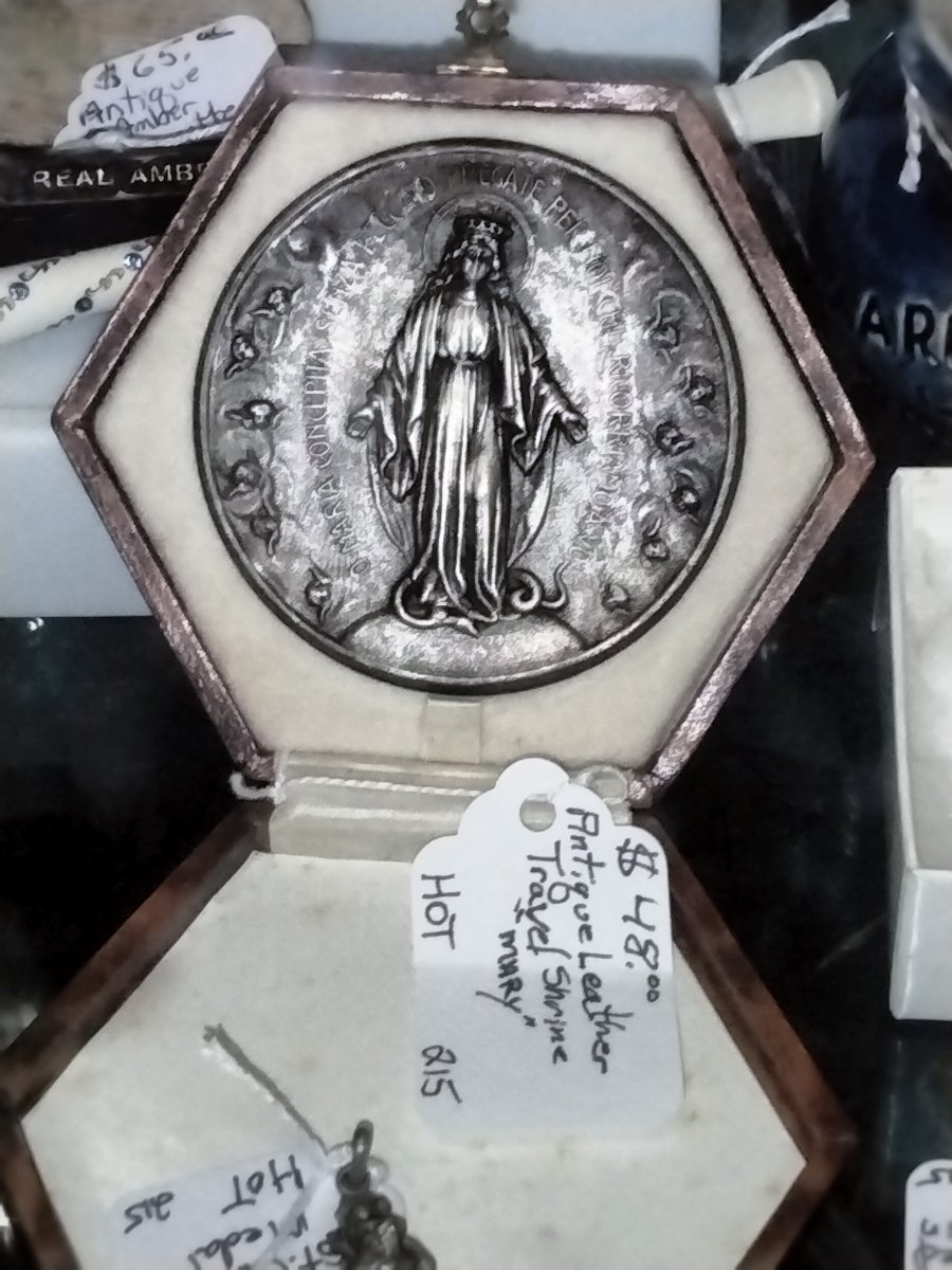 A portable devotional 'pocket shrine' featuring a high-relief medallion of the Virgin Mary housed in a custom-fitted, hexagonal leather-bound case.