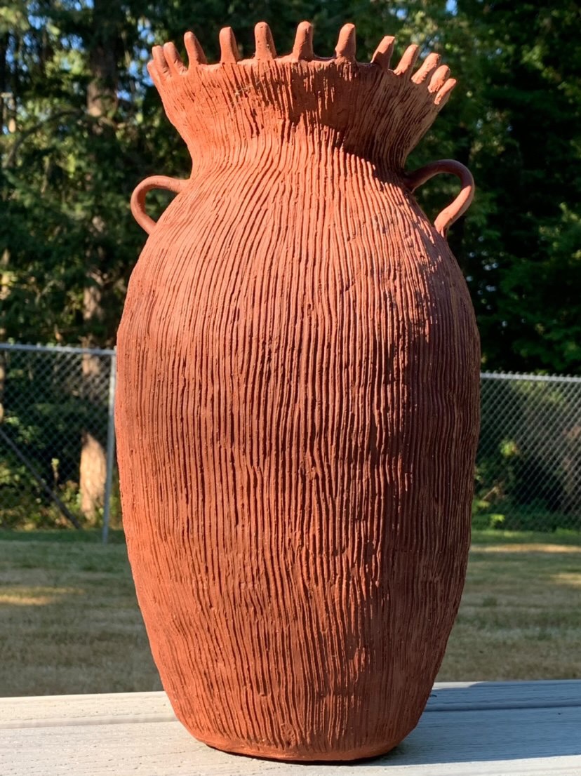 A commanding terracotta vessel featuring a heavily textured 'combed' surface and a distinctive crown-like crenellated rim.