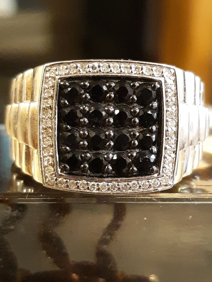 A bold, masculine statement piece featuring a 16-stone cluster of black stones framed by a halo of white accents. The design is defined by its 'Presidential' watch-link style shank, merging the worlds of horology and fine jewelry.