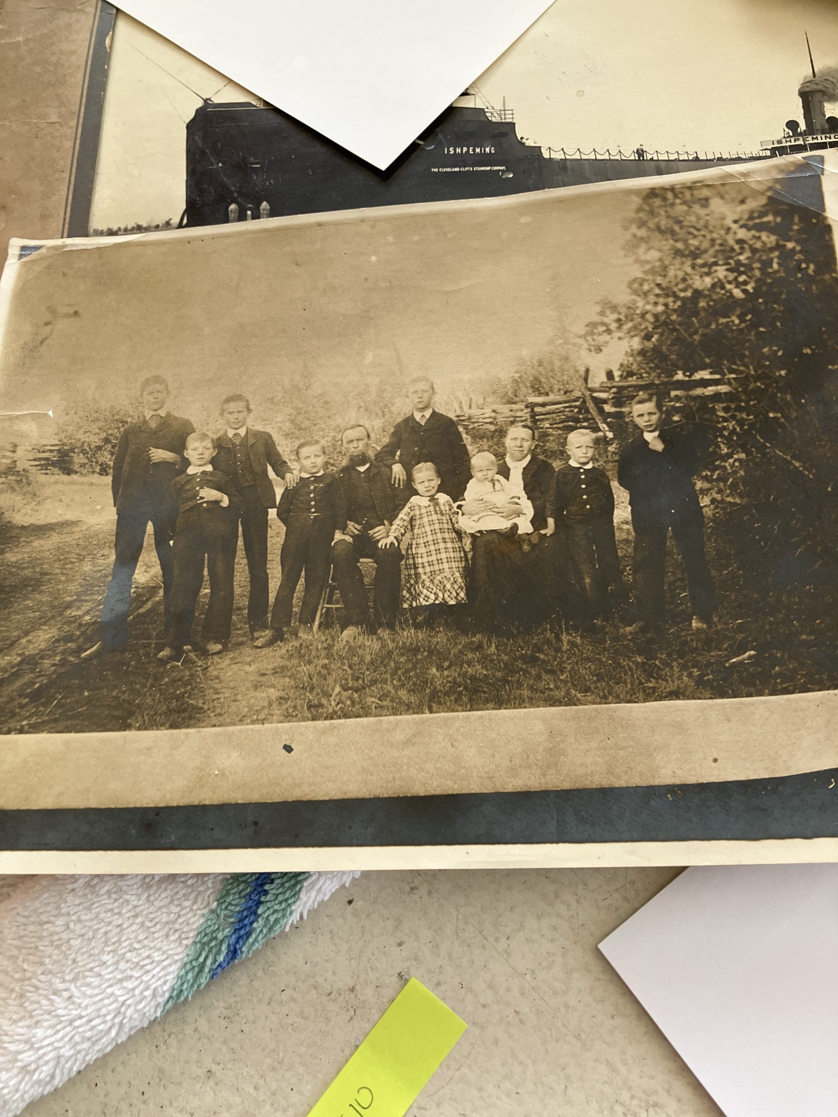 The presence of the 'Ishpeming' steamship photograph in the background strongly suggests this family hailed from the rugged Upper Peninsula of Michigan, a land defined by iron ore and deep woods.