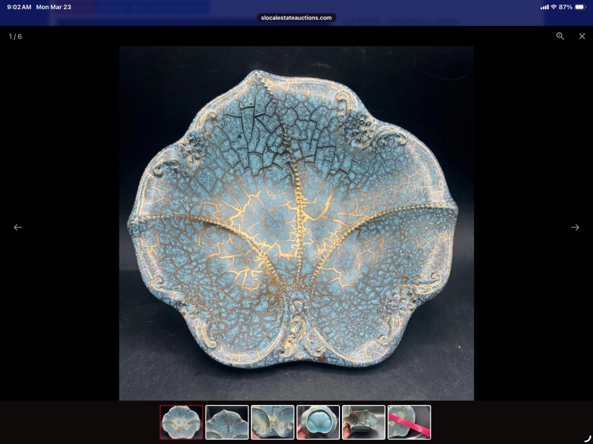 The bowl appears to be in excellent vintage condition with no visible chips to the delicate raised scrollwork or the scalloped rim. Value is driven by the popularity of Mid-Century Modern Italian ceramics and the excellent preservation of the gold leaf.