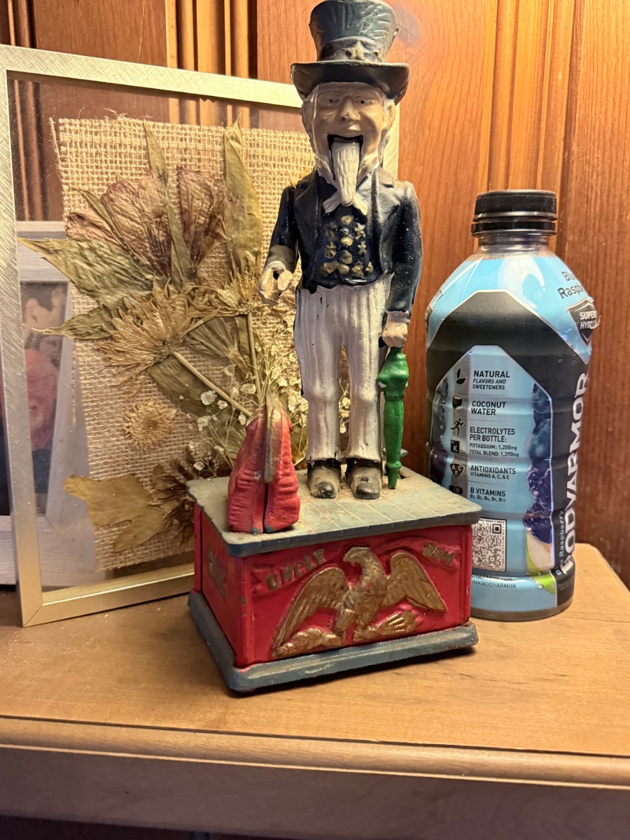 This is a cast iron mechanical bank featuring the iconic figure of Uncle Sam, designed to 'swallow' coins through a clever lever-activated mechanism.