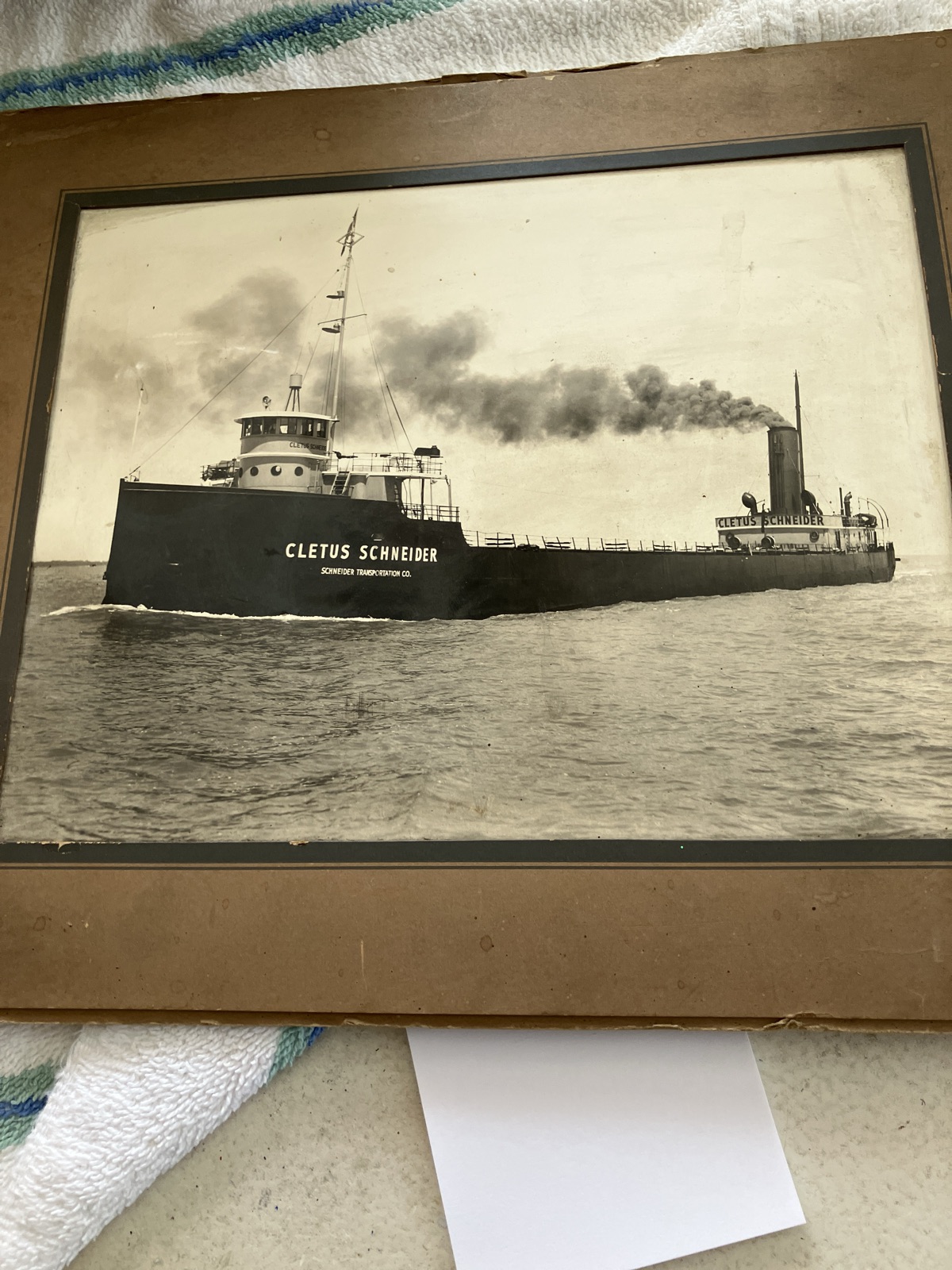 The original cardboard mount shows significant chipping, edge wear, and some water staining, which is typical for utilitarian maritime displays. Value is driven by the specific vessel's history and the strong market for Great Lakes maritime memorabilia.