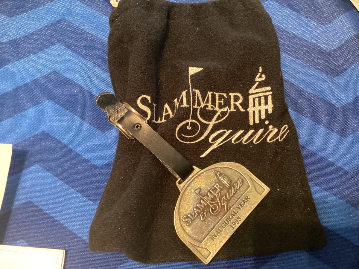 A heavy cast-metal commemorative bag tag and original drawstring pouch marking the 1998 opening of the Slammer & Squire golf course. The piece features an antiqued bronze finish and honors the legacy of two of golf's greatest legends.