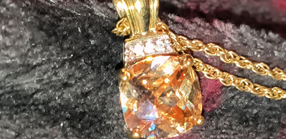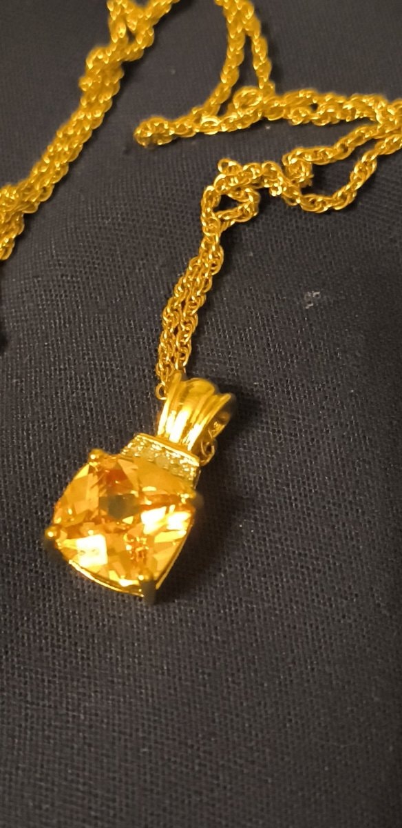 A vibrant, honey-hued cushion-cut citrine pendant set in yellow gold with a delicate row of white accent stones. This piece exemplifies the 'accessible luxury' movement of the late 20th century, focusing on…