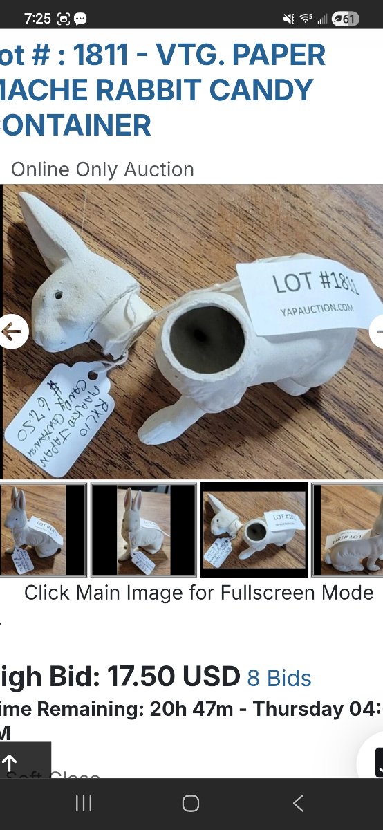 The item appears to be in excellent vintage condition with the original glass eyes intact. While the current auction bid is lower, retail prices for Japanese paper mache containers in this condition typically range from $40 to $60.