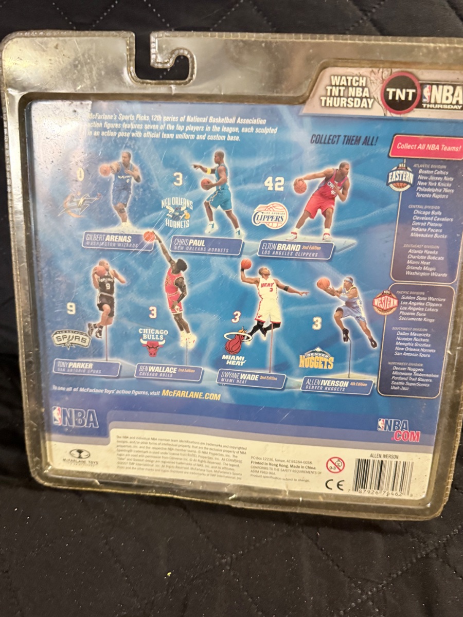 The plastic blister packaging is severely crushed and dented on the left side, which is a major detractor for serious toy collectors who prioritize packaging integrity. While Allen Iverson is a Hall of Fame name with high demand, the significant crushing of the plastic bubble packaging greatly impacts the value for 'Mint on Card'…