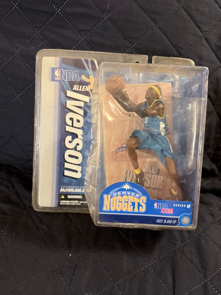 This is a highly detailed 'Sports Picks' figure featuring the legendary Allen Iverson in his iconic Denver Nuggets powder blue uniform.