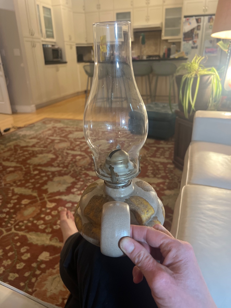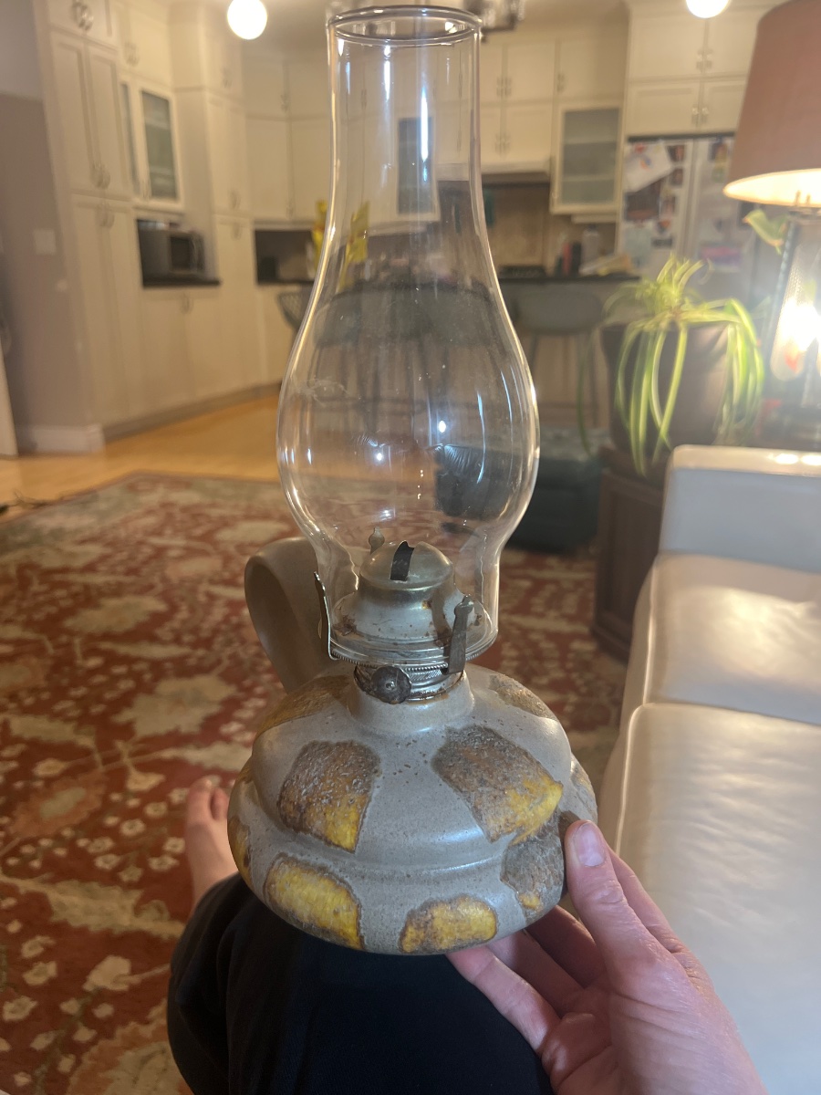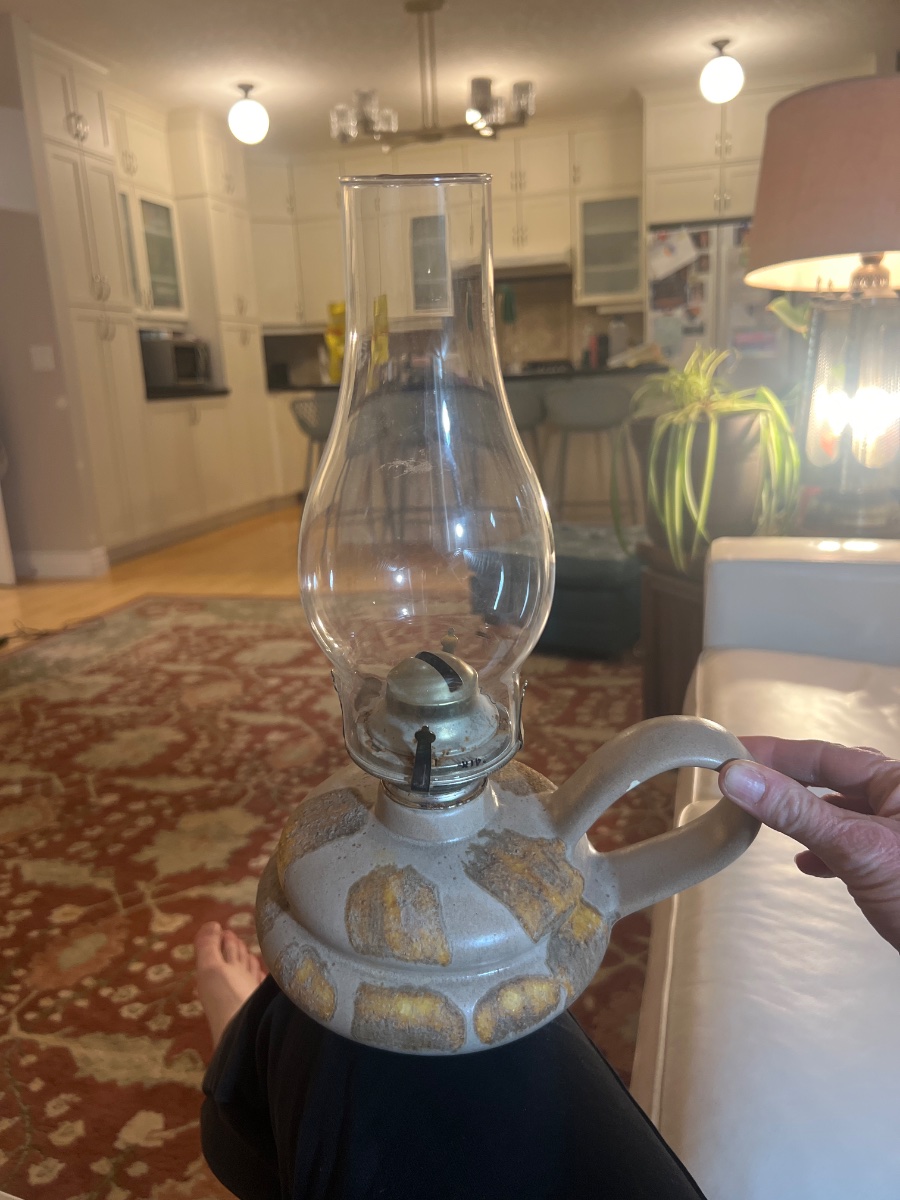 A charming stoneware oil lamp featuring a 'finger loop' handle and a distinctive earth-toned reactive glaze.