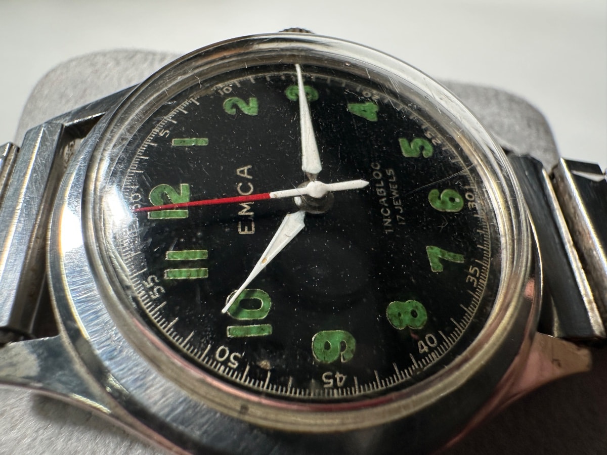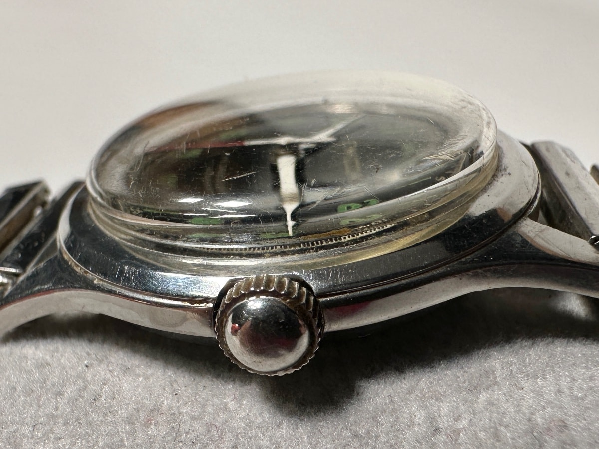 The acrylic crystal is heavily scratched and would benefit from a professional polish or replacement to reveal the dial. The case shows honest wear consistent with daily use over 70 years, and the luminous material appears original.