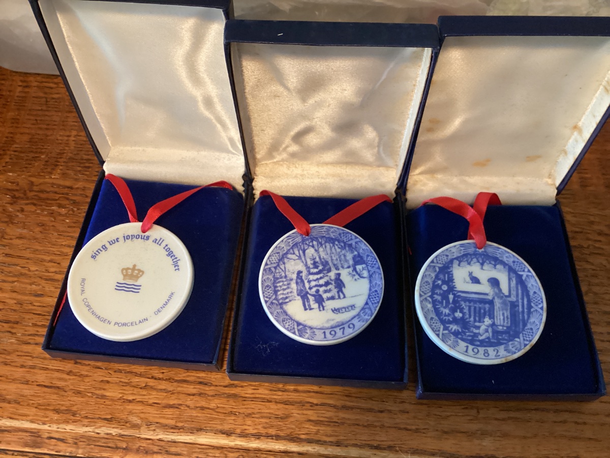 A set of three fine porcelain medallions featuring the iconic cobalt blue underglaze synonymous with Danish ceramic excellence.