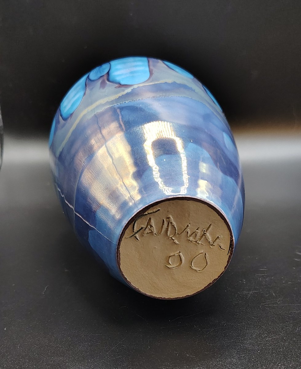 The vase appears to be in excellent condition with no visible chips or cracks. Value is driven by the intensity of the cobalt blue and the quality of the iridescent 'flash.' While David Fairman is a respected name in studio pottery, the market for…