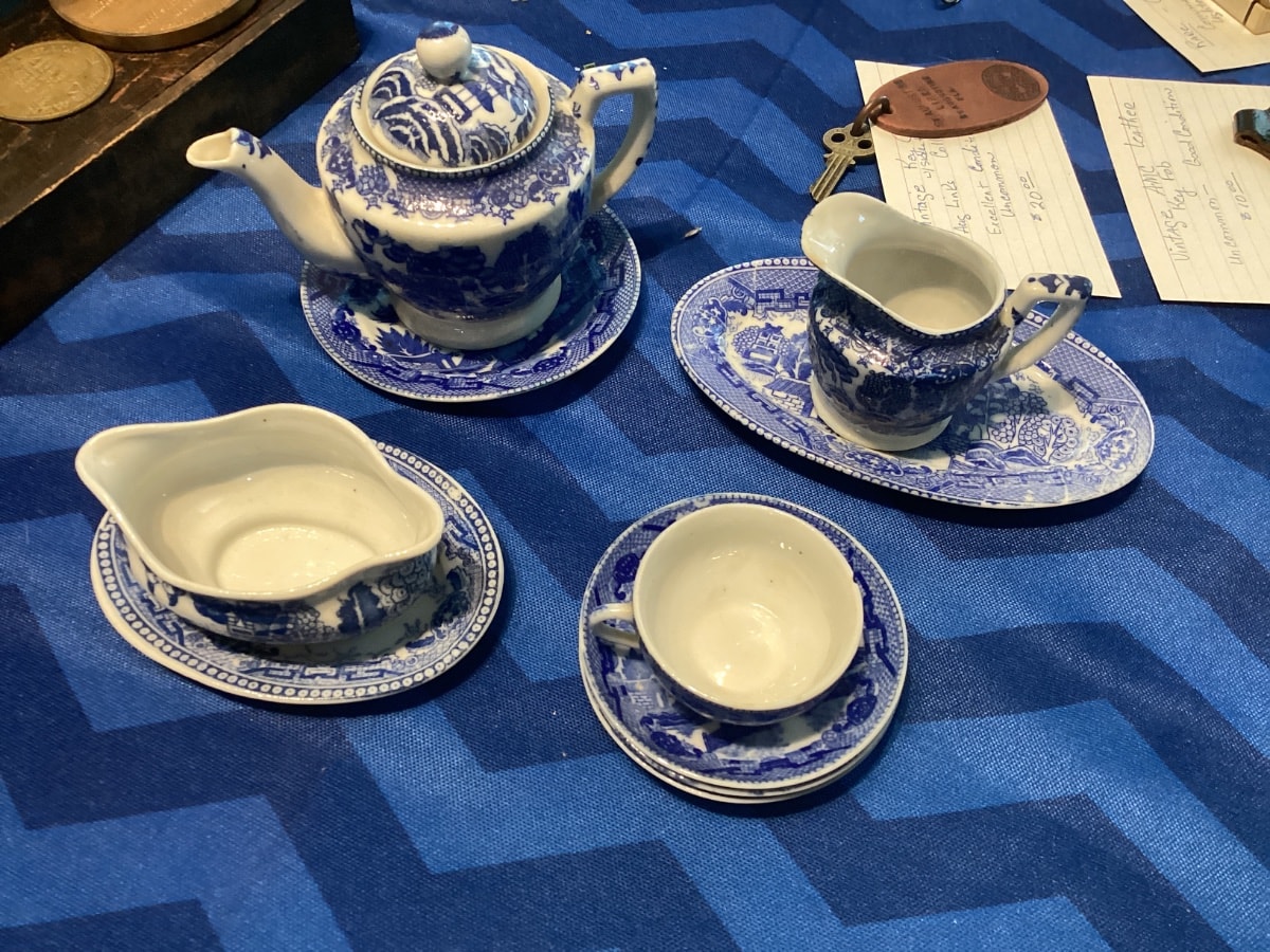 This is a charming miniature tea service featuring the iconic 'Blue Willow' pattern, a design that has captivated the world for over two centuries.