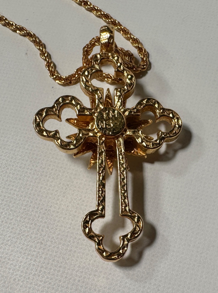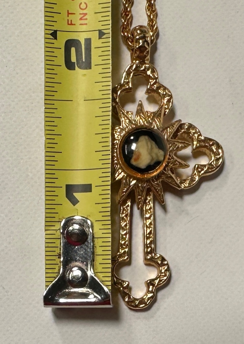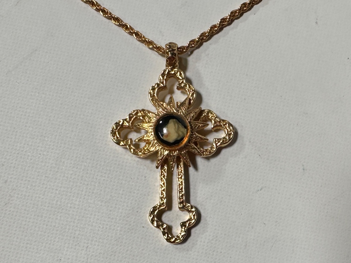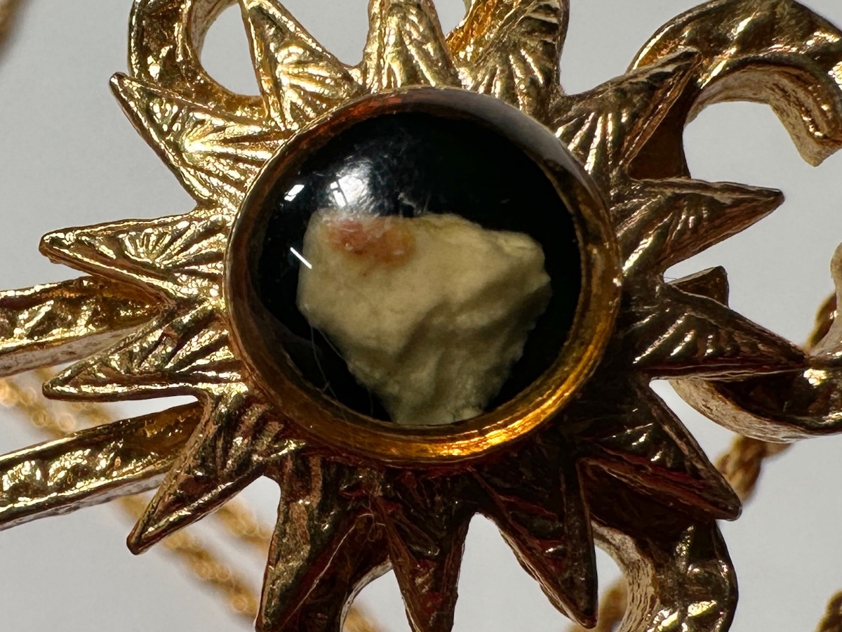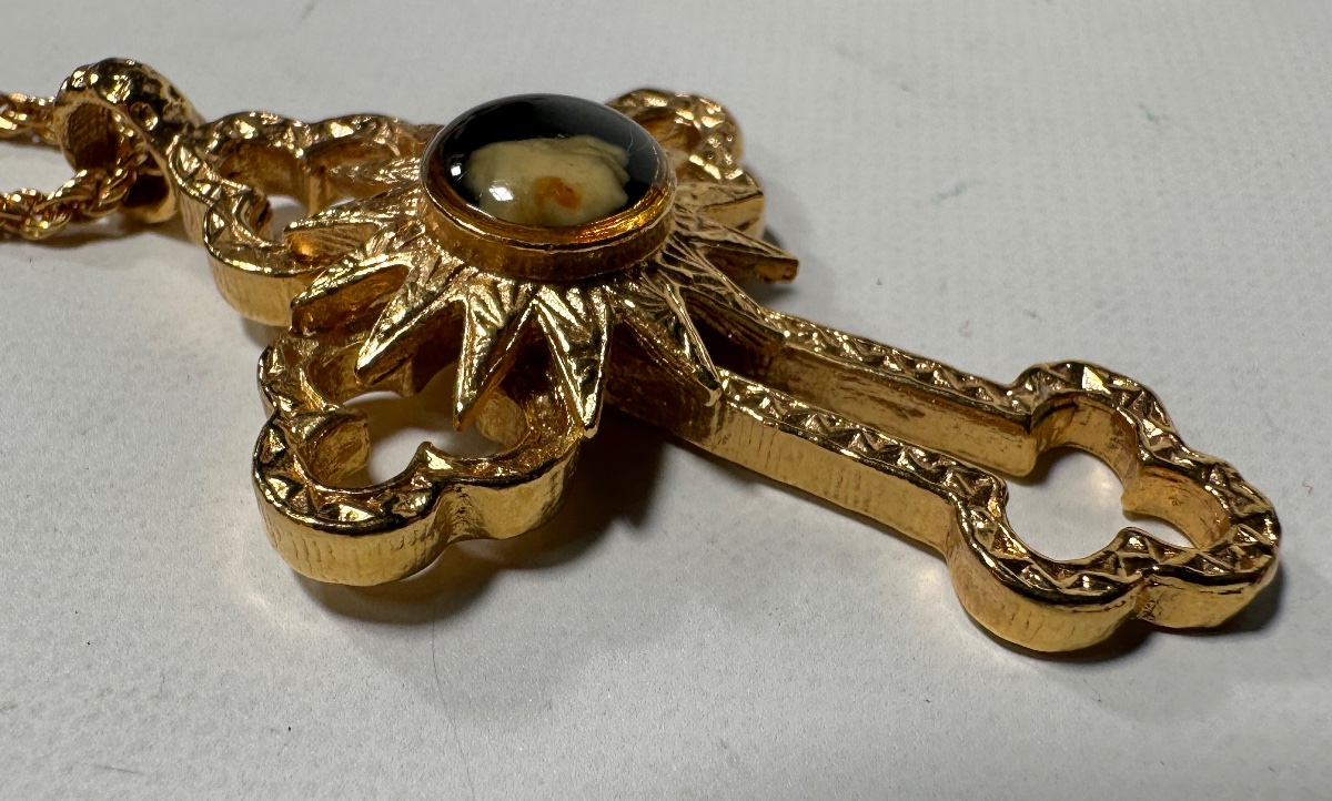 The gold-tone finish appears well-preserved with minor surface wear consistent with age. The central cabochon is clear and the fragment inside is secure. These specific Met reproductions have a dedicated following among collectors of 'Museum Jewelry.' Value is driven by the specific historical model it replicates and the…